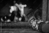 Feet in woollen socks by the Christmas fireplace. Woman relaxes by warm fire and warming up her feet in woollen socks. Close up on feet. Winter and Christmas holidays concept.