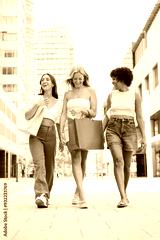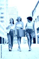 Vertical. Group of young women walking to a store while gossiping. Three girls with shopping bags, laughing and having fun as they take a stroll in the city downtown. Female friends moving to the mall