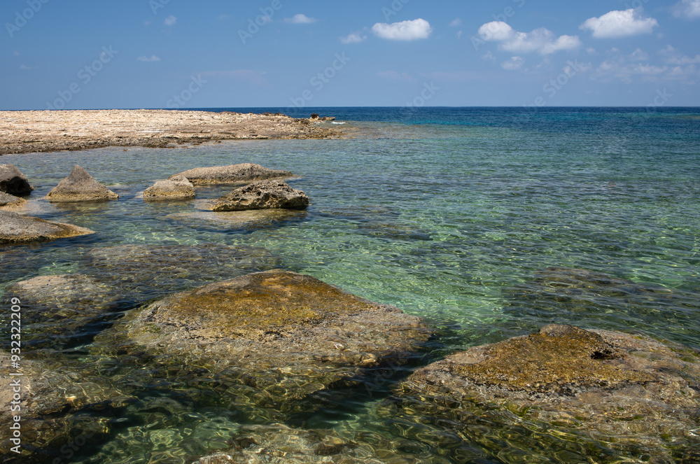 There are many flat rocks in the water along the coast of the Mediterranean. The sea is almost transparent. You can see the bottom. In the background, the horizon and the blue sky.