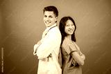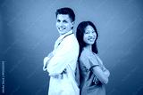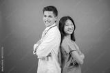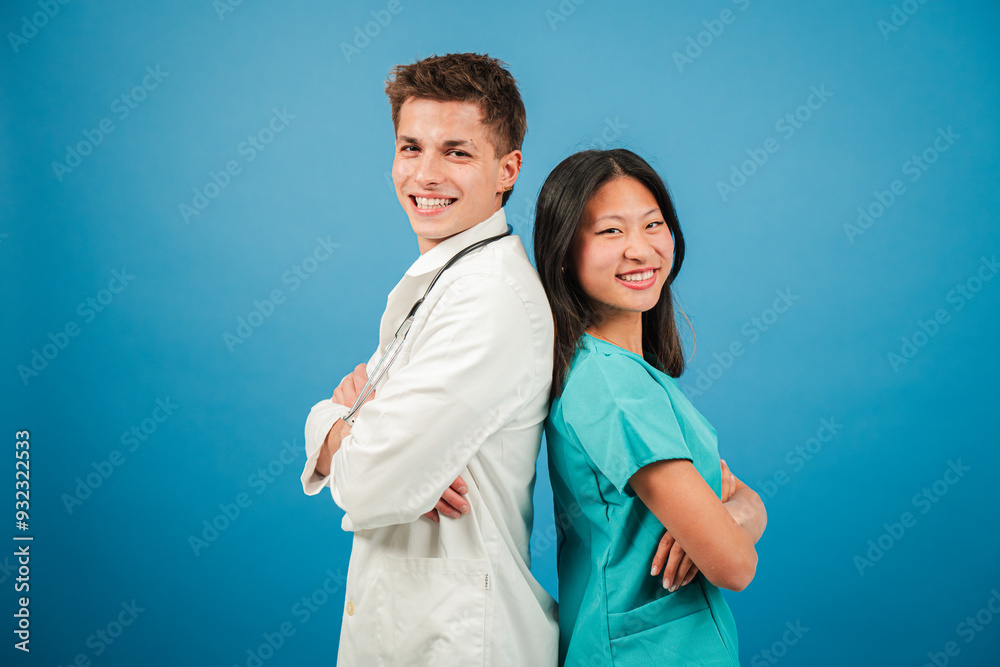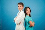 Two young adult doctors, specializing in medicine are smiling and looking at the camera against a blue background wall. The team includes a surgeon, a cardiologist, a nurse, and an assistant physician