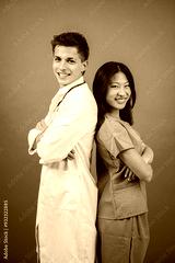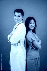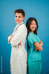 Two young adult doctors, specializing in medicine are smiling and looking at the camera against a blue background wall. The team includes a surgeon, a cardiologist, a nurse, and an assistant physician