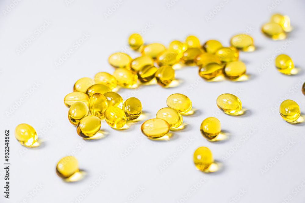 Yellow capsules lie on a white table. Vitamins D, Vitamin C, fish oil. Health prevention. Medicine