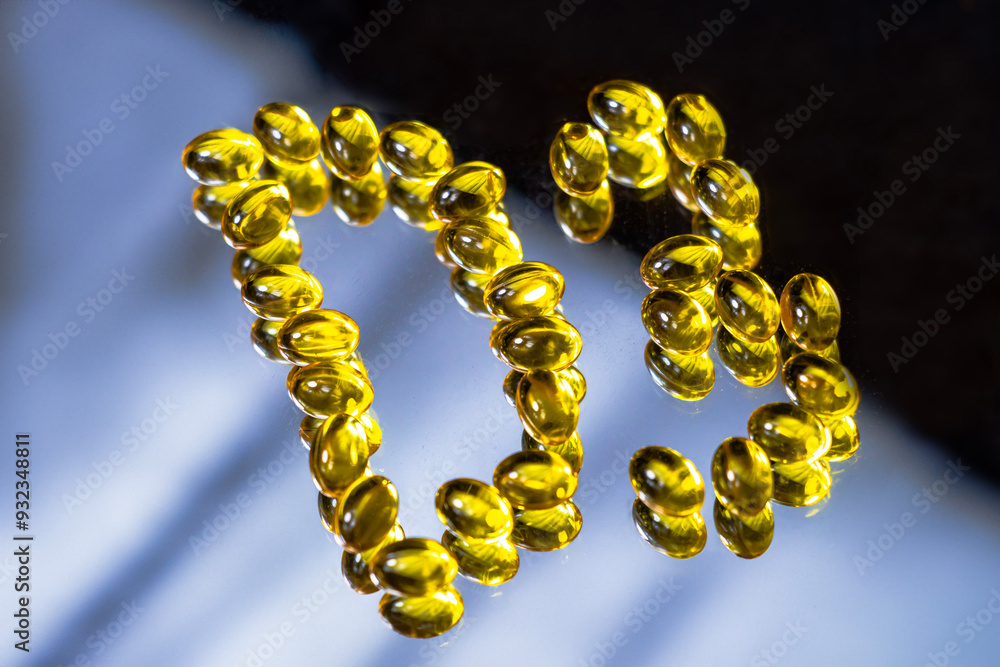 Vitamin D3 is laid out from yellow capsules. Health prevention. Vitamin deficiency