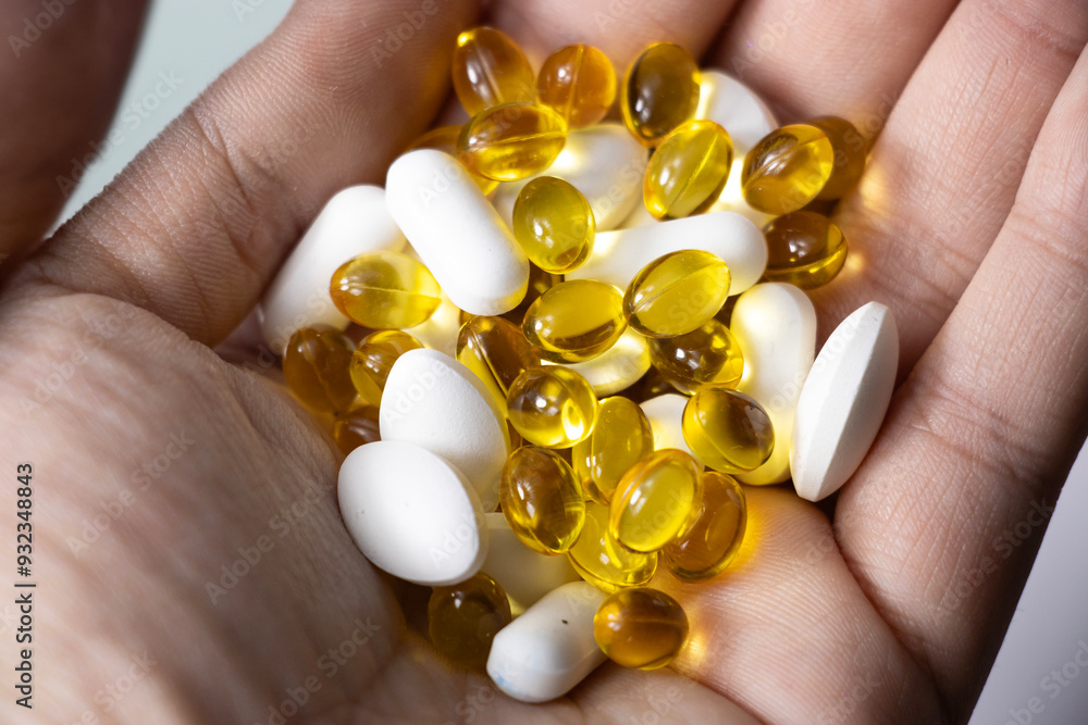 Tablets are in the hand. Yellow capsules, white tablets. Health prevention. Disease