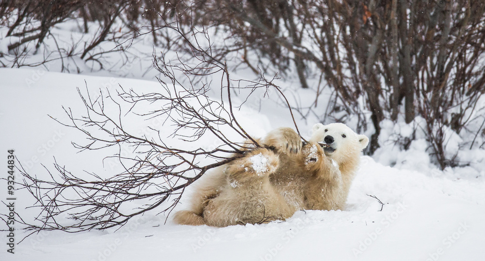 Little Bear plays with a branch in the tundra. Canada. An excellent illustration.
