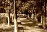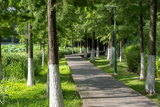 Background texture of a curved wooden walkway, footpath, or boardwalk through the lush green landscape in a public urban park with tree shade. Sun Lake Park, Ningbo China.