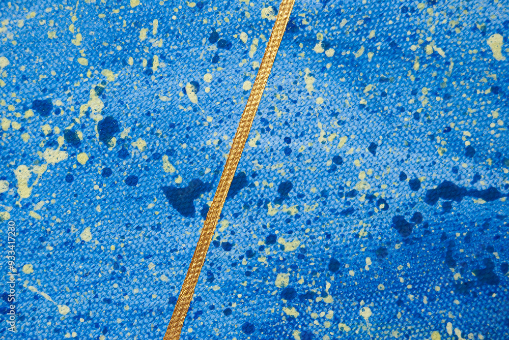 A vibrant abstract wallpaper featuring a blue acrylic surface accented with a striking golden line and colorful drops of paint