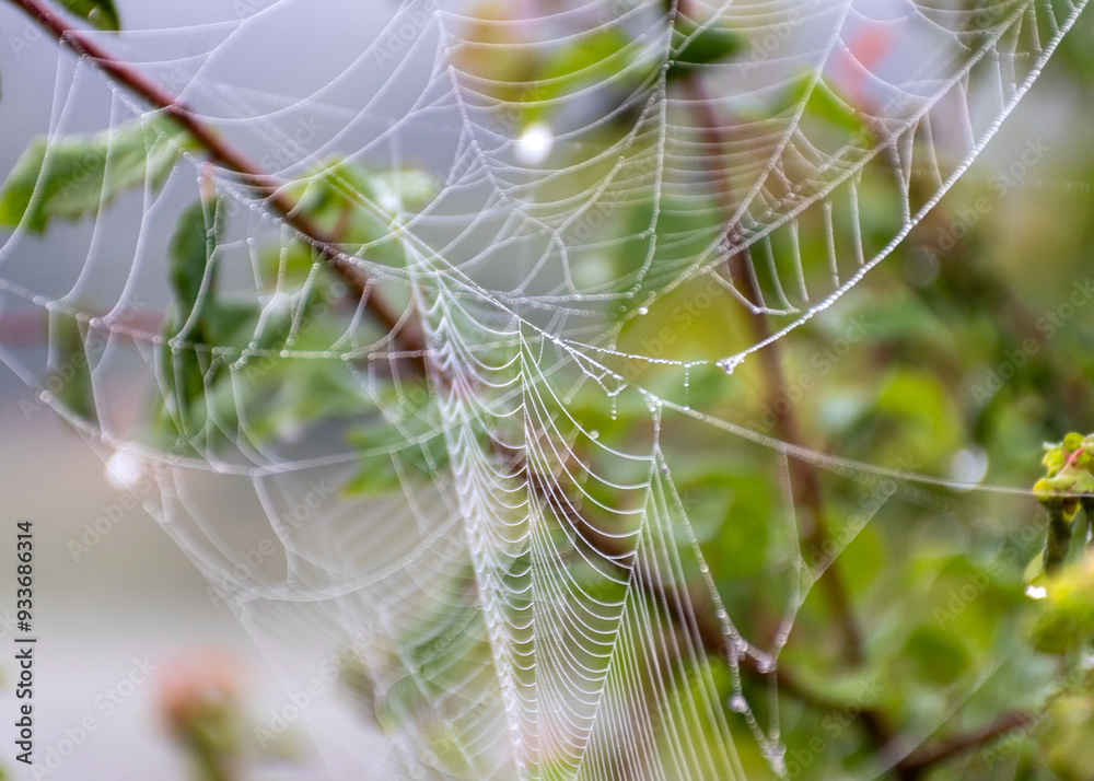 dew drops on spider webs, foggy landscape, early summer morning, morning dew