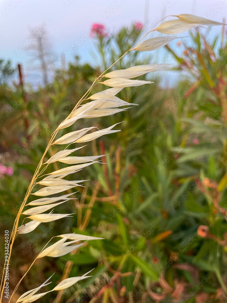Wild oats, or empty oats, are a noxious weed for rural dwellers. (Avena fatua). Poaceae. Bifidus. A weed growing in clusters along roadsides. Dried white flowers on a green background