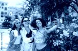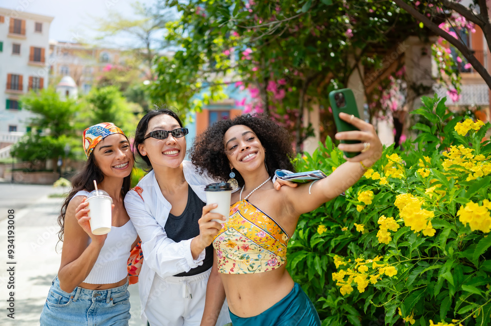 Three young women of diverse backgrounds pose for a selfie on a sunny day, each holding a drink. They are smiling, enjoying a vibrant, outdoor setting surrounded by lush greenery and colorful flowers.