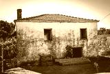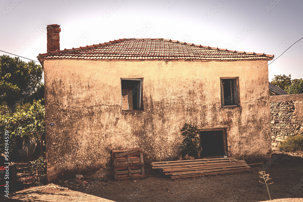 An old, weathered house with a tiled roof.
