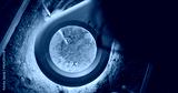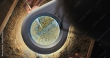 Close up of paleoanthropologist or archaeologist cleaning bone of ancient prehistoric human with brush. Scientist works with fossil remains in archaeological laboratory. View through magnifying lamp.