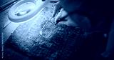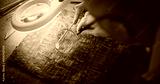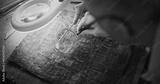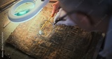 Senior archaeologist looks through magnifying lamp, studies ancient Egyptian papyrus with colleague in archaeological laboratory. Scientists work with cultural heritage of extinct human civilization.