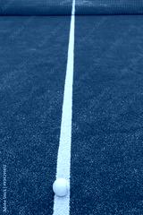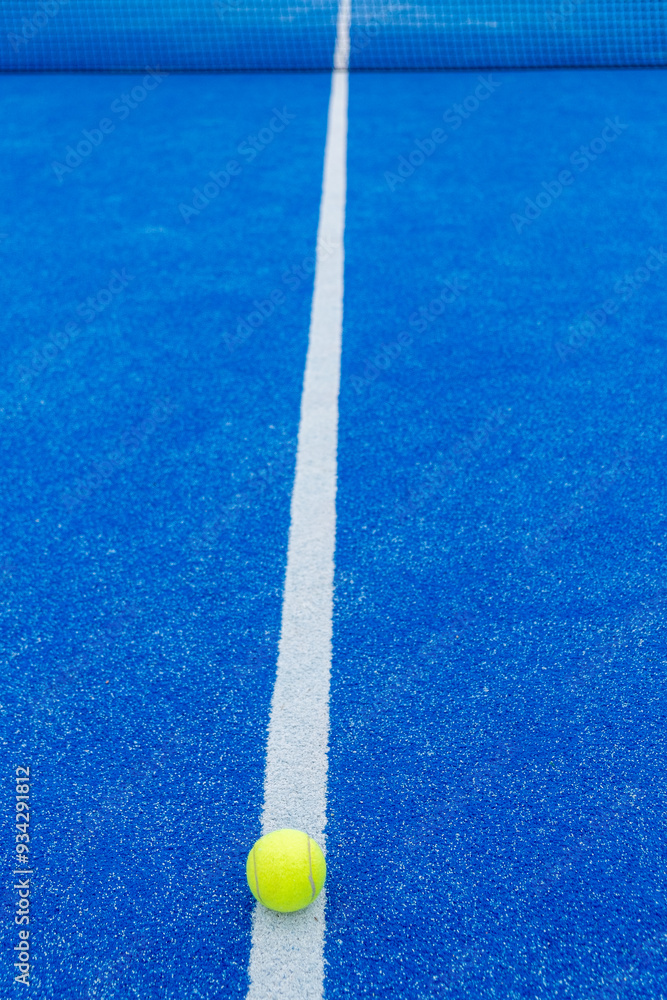 Paddle tennis ball on the center line of a blue paddle tennis court.