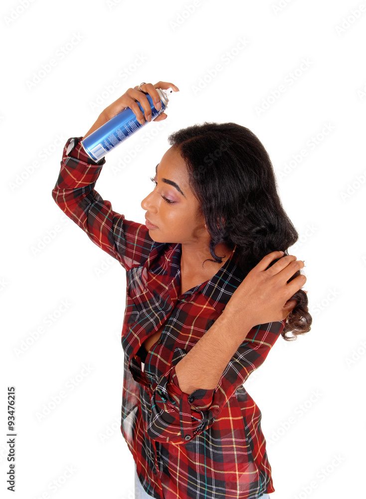 African american woman using hair spray.