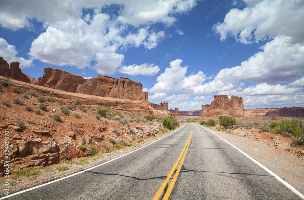 Scenic desert road with beautiful cloudscape, travel concept, Utah, USA.