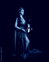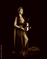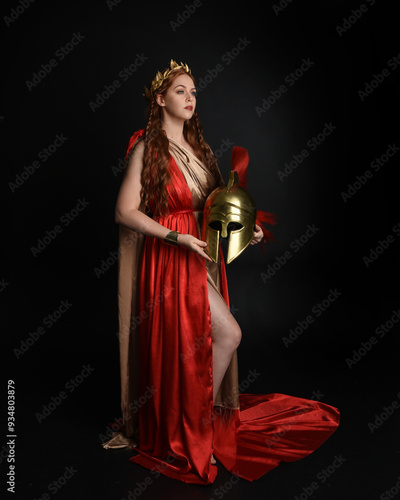 Full length portrait of beautiful female model wearing grecian red silk gold roman robes, historical fantasy goddess costume holding spartan warrior helmet. Standing pose isolated studio background.