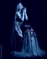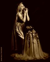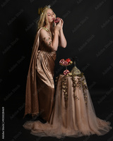 Full length portrait of beautiful female model wearing gold grecian silk toga robes, historical fantasy goddess persephone holding pomegranate fruit. Standing pose isolated studio background.