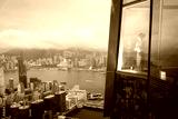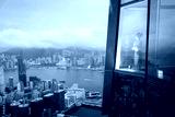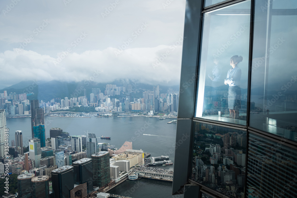 Successful businesswoman in suit standing in office looking through window at big city buildings