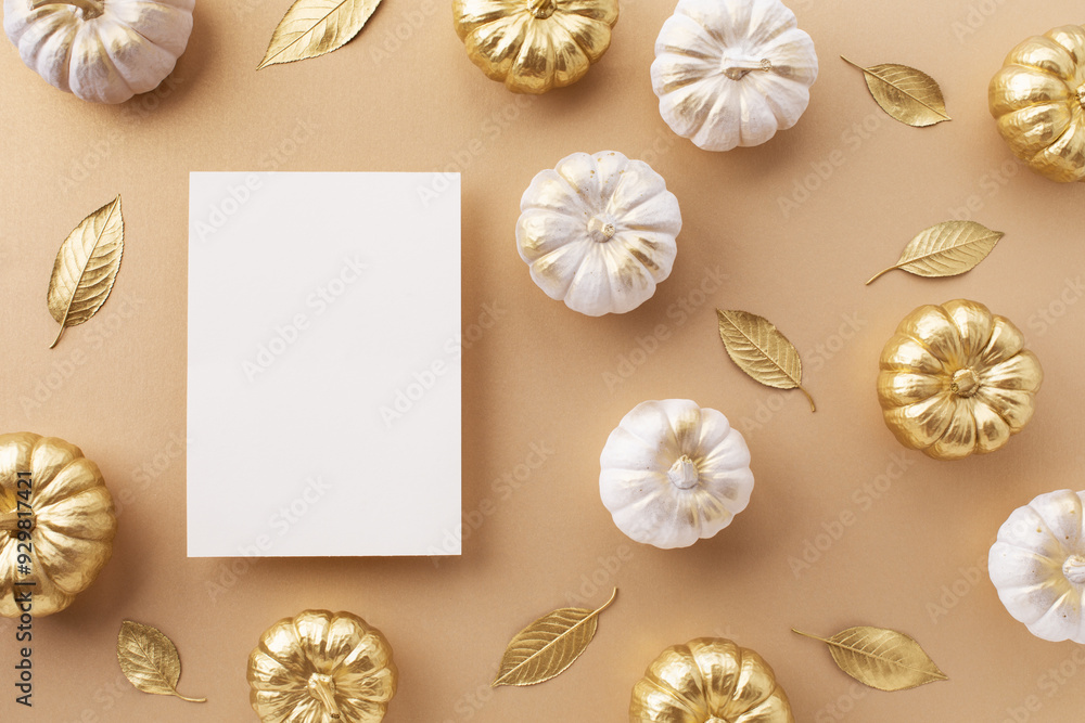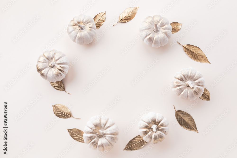 Stylized white and gold decorative pumpkins and golden leaves border on a pale pink background for autumn and Thanksgiving cards.