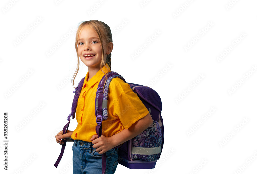Cute girl with schoolbag smiling. Back to school. PNG file with transparency.