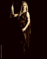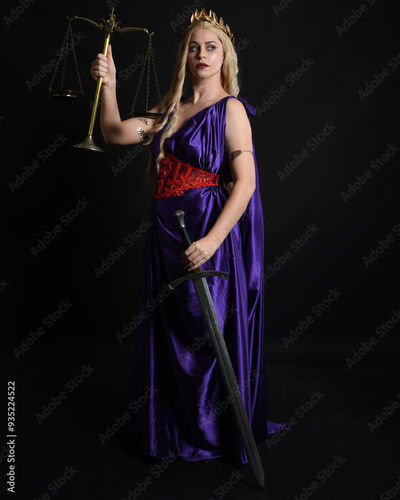 Close up portrait of beautiful blonde female model wearing silk grecian toga dress, holding justice scales, historical fantasy goddess. isolated dark studio background.