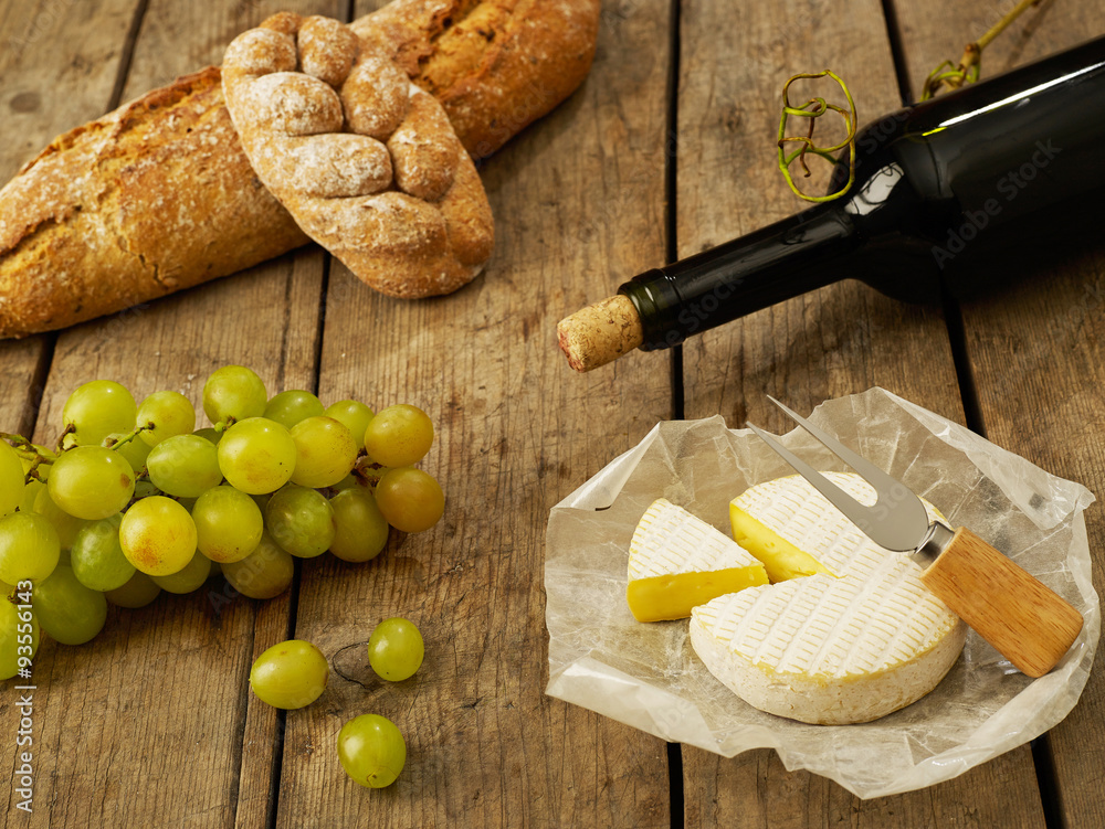 Wine, bread, cheese and grapes