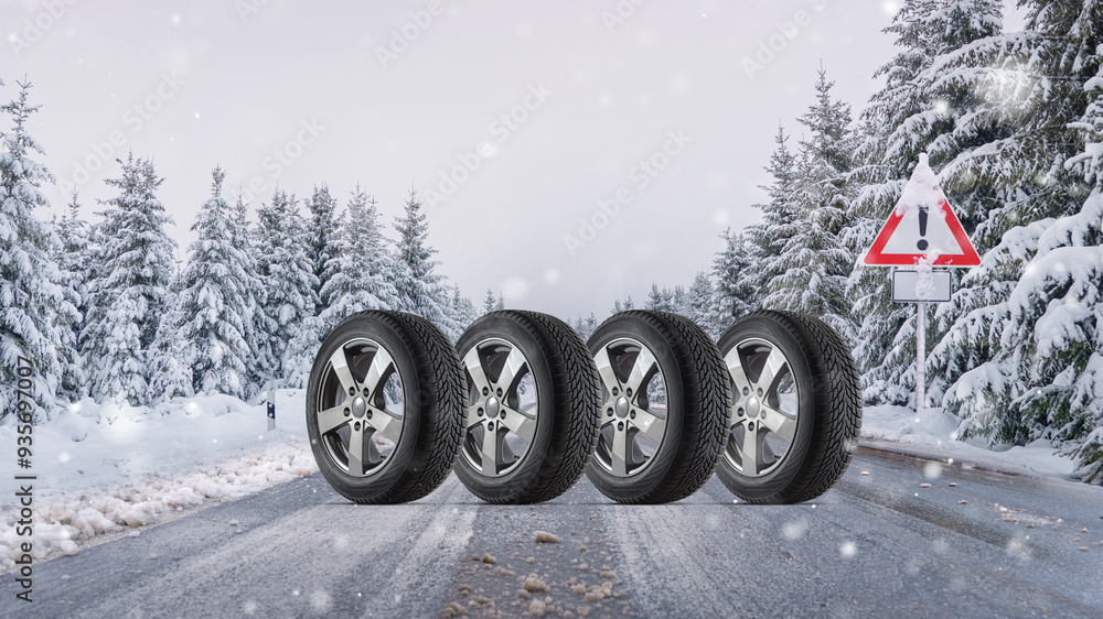 close up winter tires on a snowy road in the mountains. Transport- und Kfz-Wartungskonzept