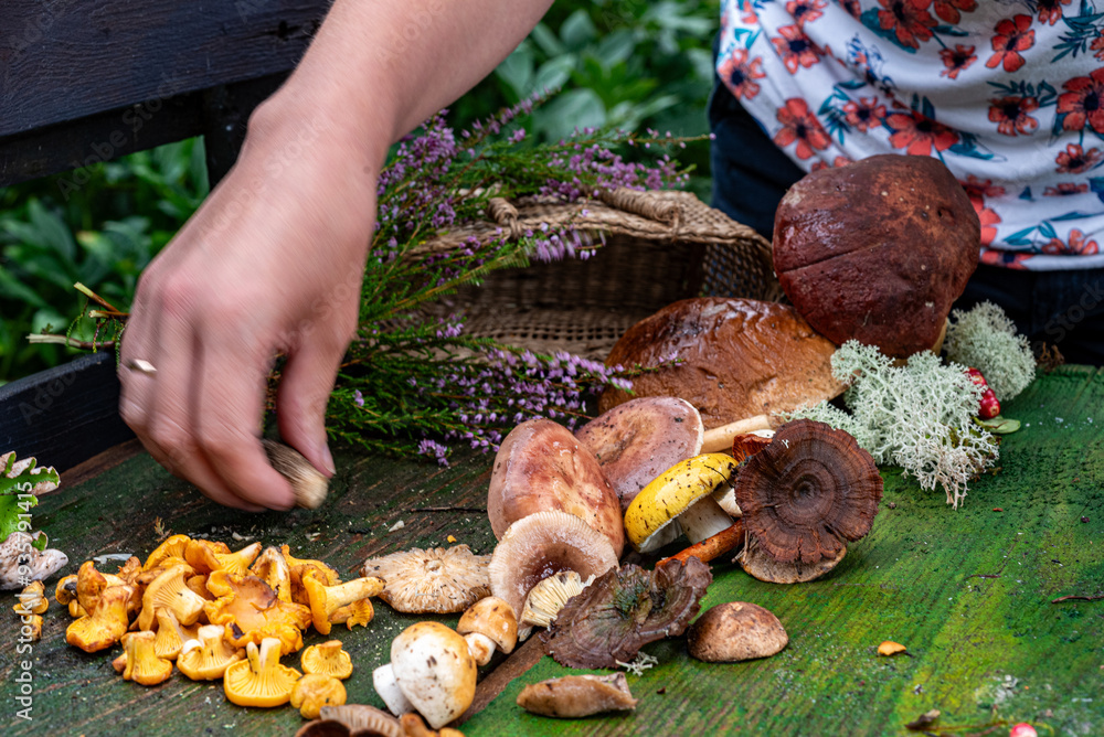 still life with wild mushrooms, autumn is the time of gathering mushrooms for winter food, autumn