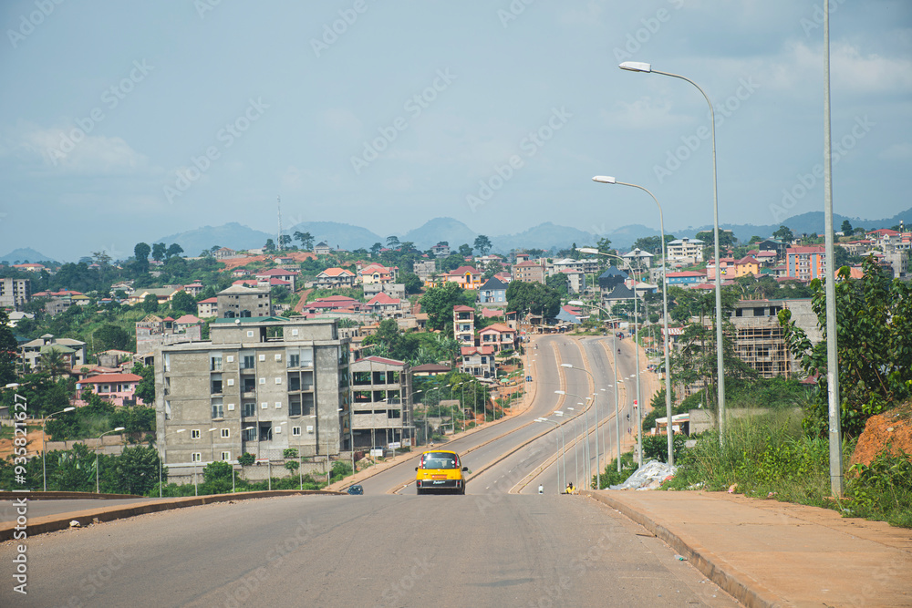 road in the city, a yellow car is driving down a road with a building in the background at Yaounde city