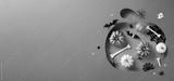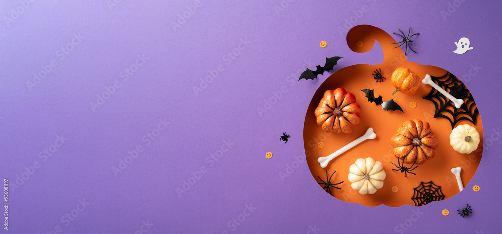 Halloween-themed design featuring pumpkins, bats, spiders, and bones on a vibrant purple and orange background creating a festive mood