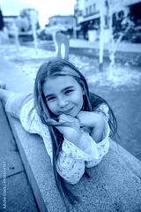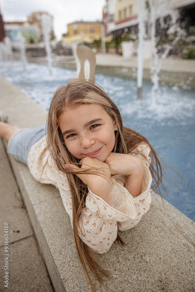 portrait of a teenage girl lying on her stomach near a fountain on a summer walk