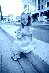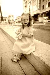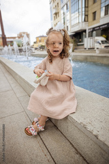 little girl playing with toy near the fountain in the summer.