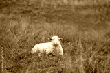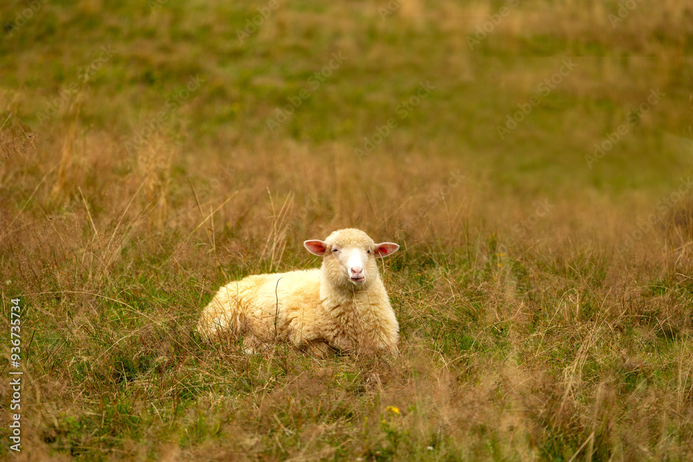 Sheep resting in a grassy meadow, calmly looking towards the camera on a peaceful day