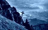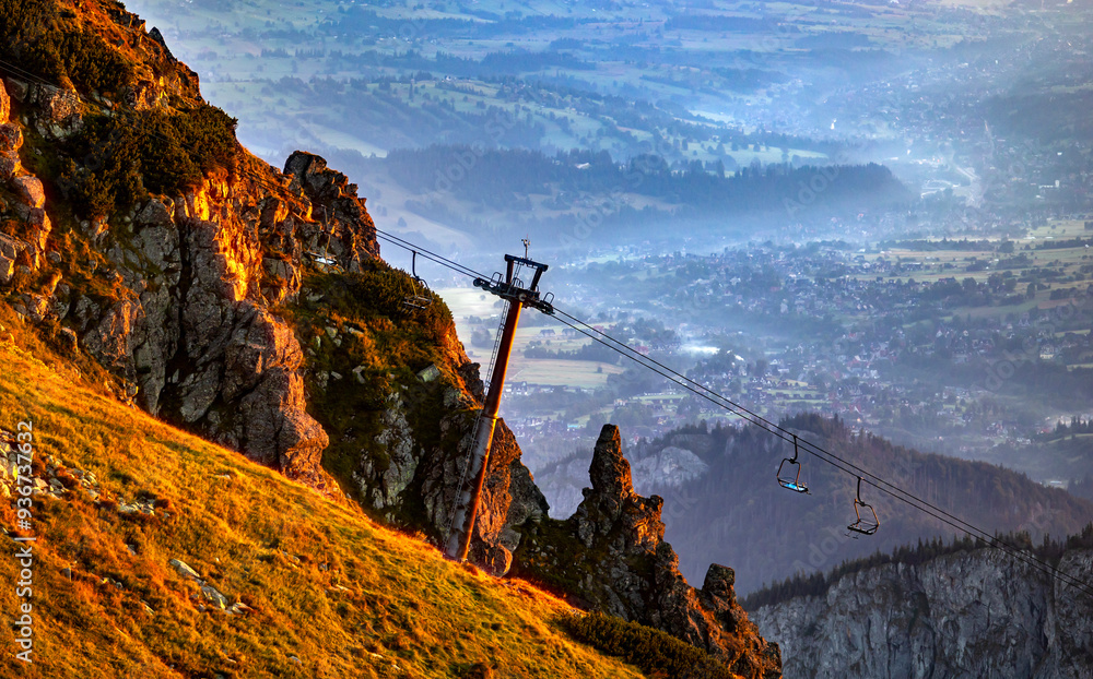 Mountain landscape at sunrise with a cable car system on a rocky slope and a misty valley in the background