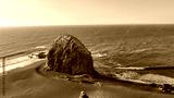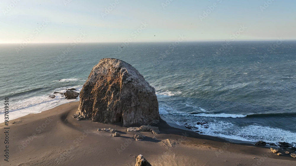 Large rocks natural monument Piedra de Iglecias Church stone on Chilean coast in Constitucion in sunset.