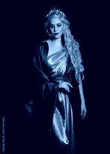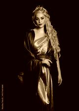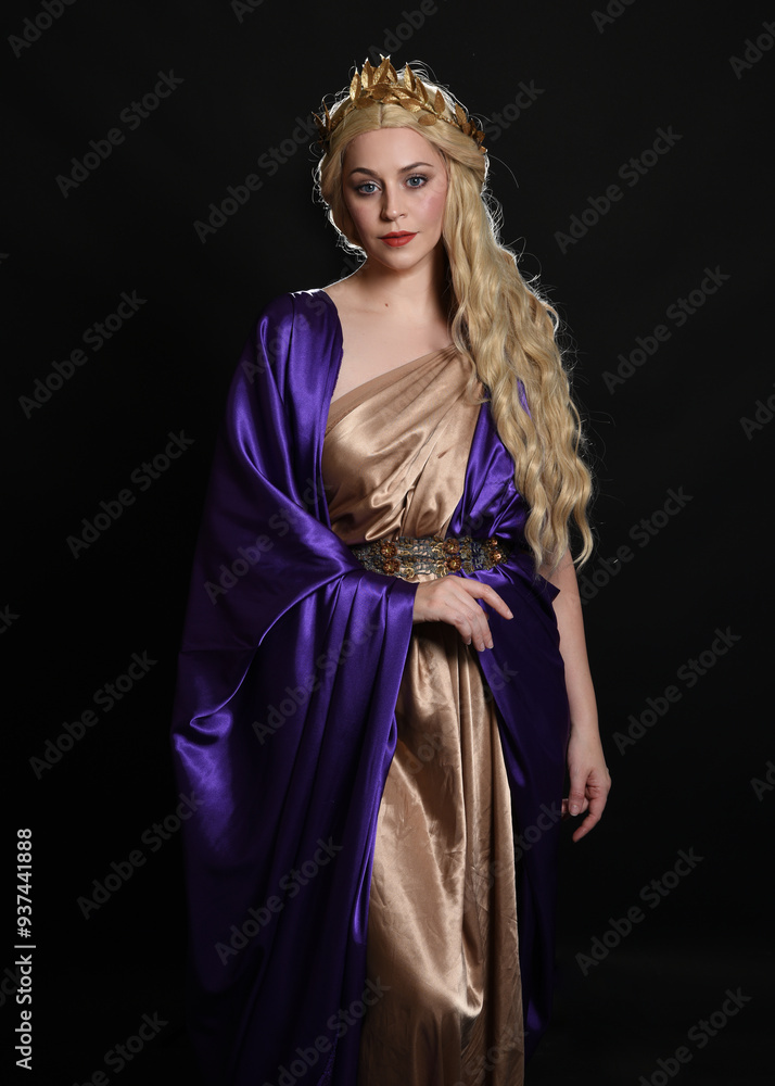 Close up portrait of beautiful blonde female model wearing purple and gold silken toga robes with royal crown, historical fantasy goddess costume. Isolated on dark studio background.
