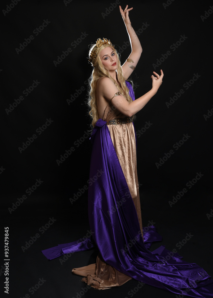 full length portrait of beautiful blonde female model wearing purple and gold silken toga robes with royal crown, historical fantasy goddess costume. Isolated on dark studio background.