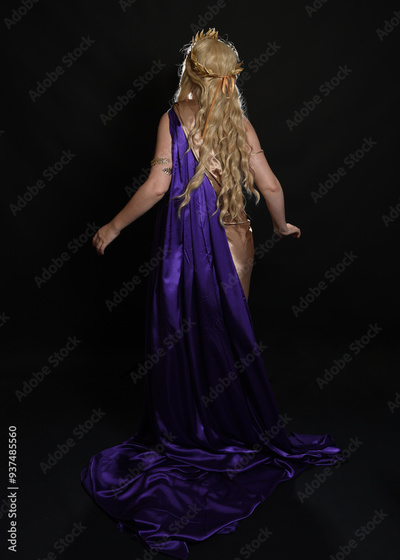 full length portrait of beautiful blonde female model wearing purple and gold silken toga robes with royal crown, historical fantasy goddess costume. Isolated on dark studio background.