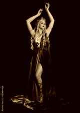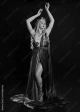 full length portrait of beautiful blonde female model wearing purple and gold silken toga robes with royal crown, historical fantasy goddess costume. Isolated on dark studio background.