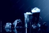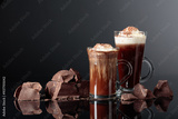 Hot chocolate with whipped cream and pieces of dark chocolate on a dark background.