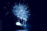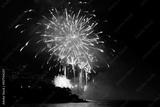 Bright Yellow and White Fireworks Over Water with Silhouetted Hillside