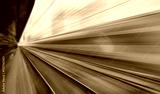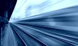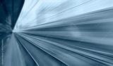 Blue high speed train runs on rail tracks - The train is going too fast as a result the air pressure is causing too much heat at the front