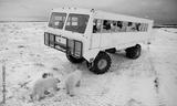The polar bear came very close to a special car for the Arctic safari. Canada. Churchill National Park. An excellent illustration for travel agencies.