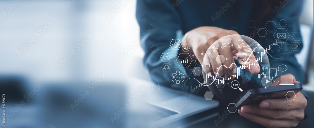 Digital marketing, Global business, e-commerce concept, Businessman using digital tablet with online marketing strategy and solution analysis, social media, content marketing plan and advertisement
