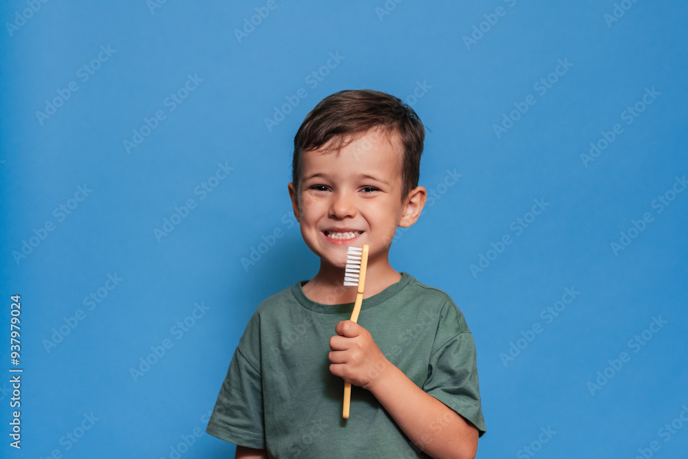 A smiling boy with healthy teeth holds a plus tooth and a toothbrush on a blue isolated background. Oral hygiene. Pediatric dentistry. Prevention of caries.