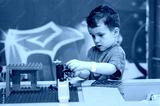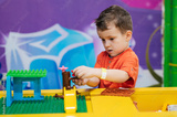 Close-up of a boy's child playing with colorful plastic bricks at a table. The kid has fun and builds from bright constructor cubes. Early learning. Educational toys
