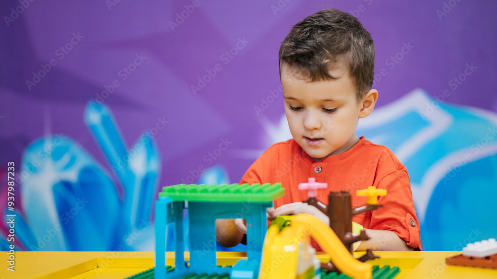 Educational toys. The picture is a plan of a boy's child playing with colorful plastic bricks at a table. The kid has fun and builds from bright constructor cubes. Early learning.
