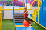 A cheerful little boy rides an amusement ride at a children's entertainment center