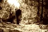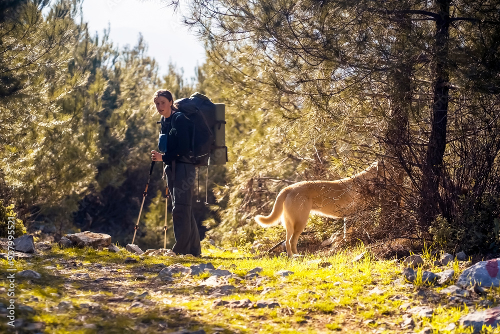 A young girl with a backpack and hiking equipment, with trekking poles, walks along the trail in the mountains and forest at sunset. A traveler with her dog walks through the national park.